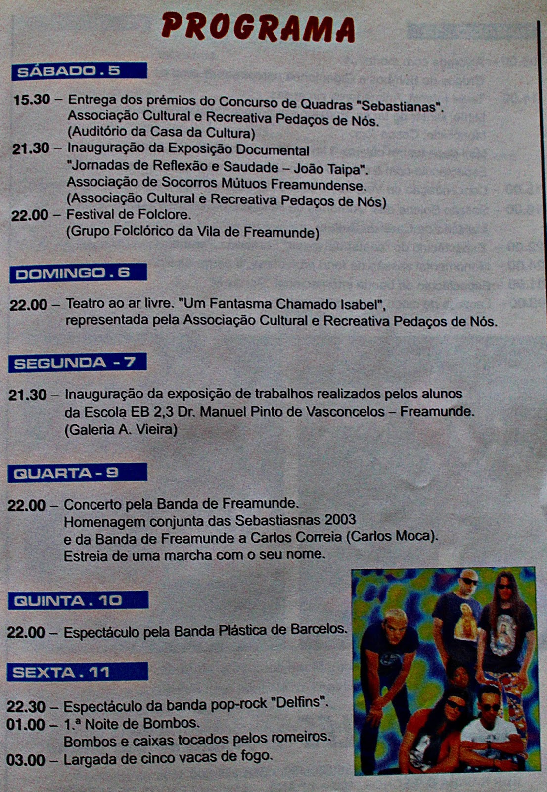 Aqui fica pra recordar as Sebastianas 2003, que se realizaram de 5 a 15 de Julho. Do vasto programa, contou entre outros, com as bandas "Delfins", "Boney M", "Fernando Pereira", "Swing & Cia", "Zézé Fernandes". Porque nunca é demais lembrar as sempre nossas Sebastianas...