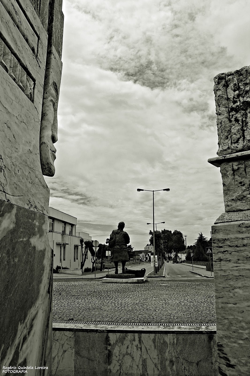 Uma fotografia entre colunas do monumento ao capão da autoria do escultor freamundense Augusto Ramos, com vista para a Avenida do Centro de Saúde.